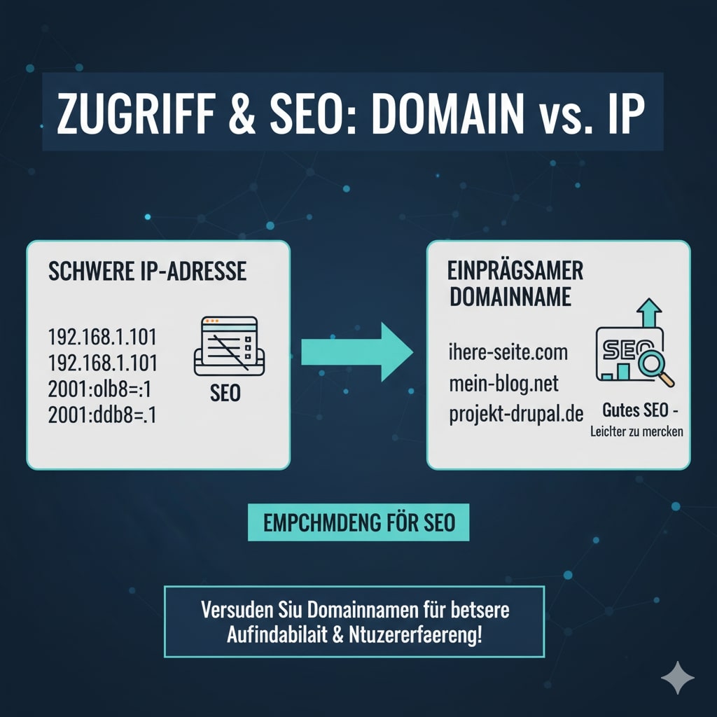 Nach der Zuweisung kann die Drupal-Seite direkt mit der zugewiesenen IP-Adresse aufgerufen werden. Da die IP jedoch aus Zahlen besteht, die man sich nur schwer merken kann, sollten Domainnamen verwendet werden, die diese IP anzeigen. Da man einen com-Domainnamen gegen eine Gebühr erhalten kann, gibt es auch Domainnamen, die man kostenlos erhalten kann. Kostenlose Domänennamen werden jedoch im Hinblick auf die Suchmaschinenoptimierung (SEO) nicht bevorzugt.