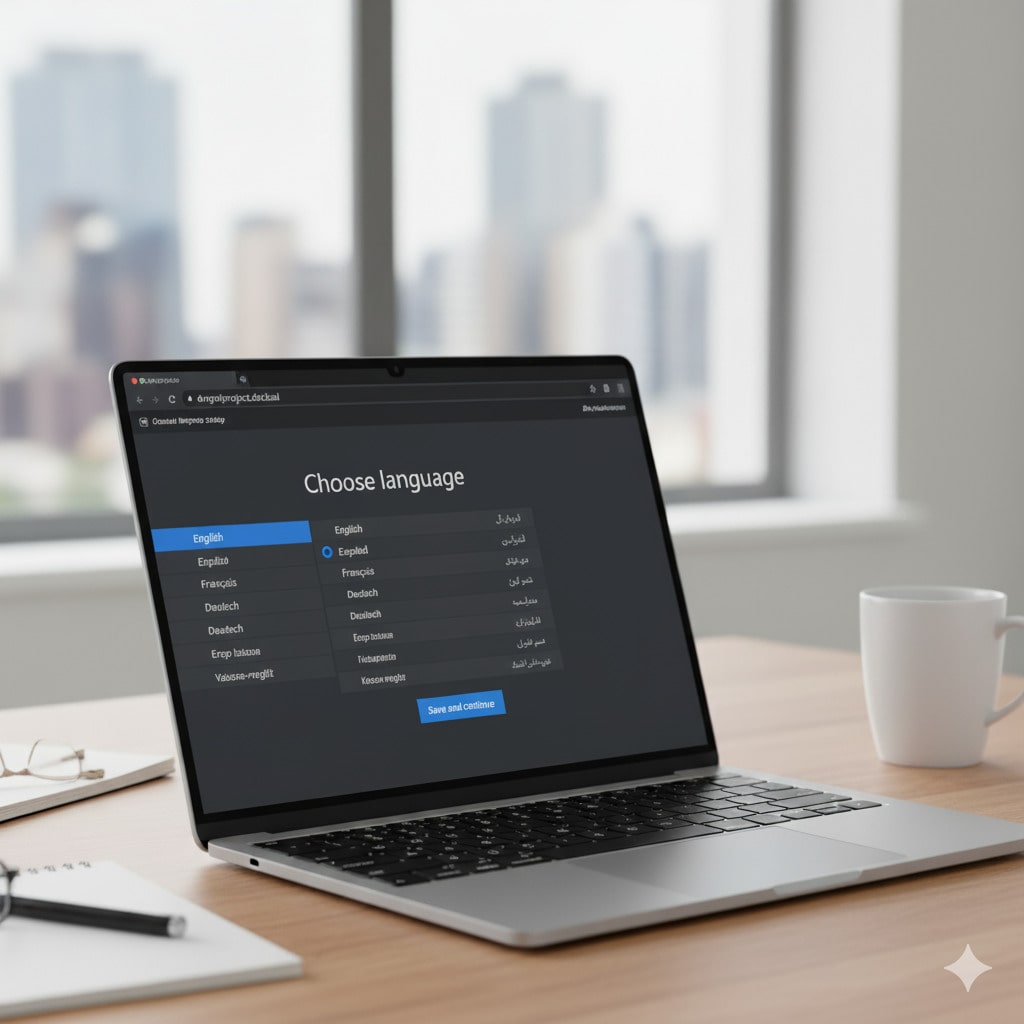 Indem wir die Adresse unseres Projekts in unseren Webbrowser eingeben, gelangen wir zur ersten Installationsseite. Dort stellen wir die Sprache ein.