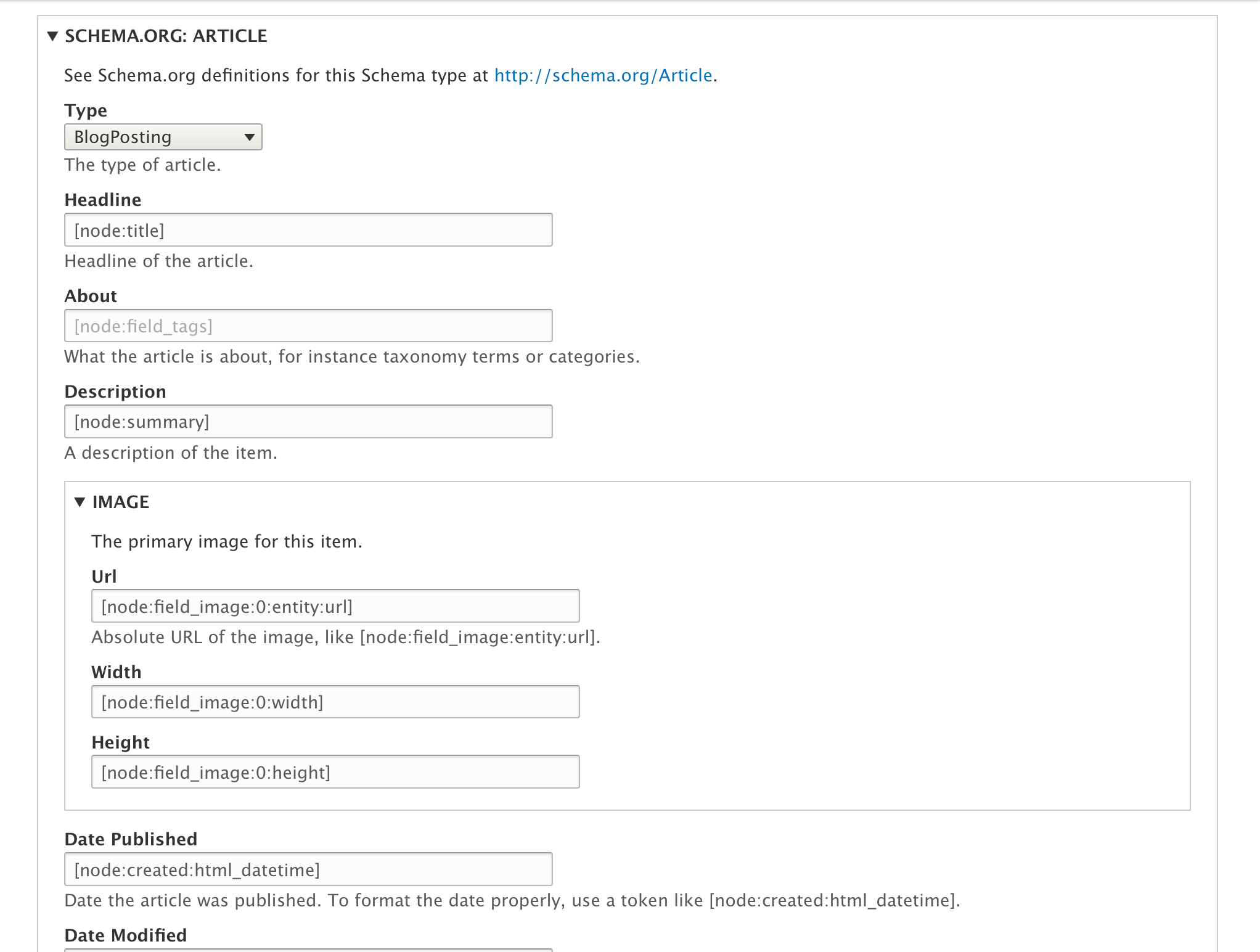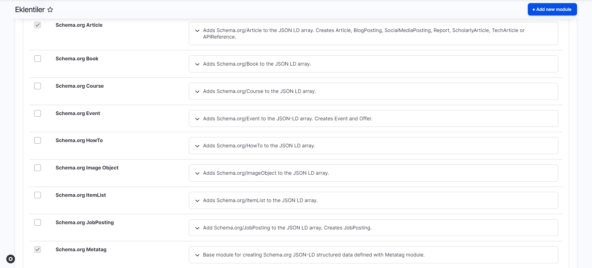 Das Schema.org Metatag-Modul erstellt Metatag-Gruppen für jeden Schema.org Objekttyp und Metatag-Tags für die Eigenschaften dieses Objekts. Es verwendet das JSON-LD-Format und ermöglicht die Konfiguration der Feldzuordnung über ein benutzerfreundliches Administrationspanel.
