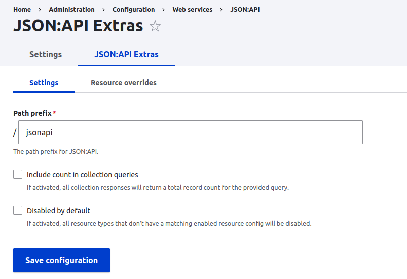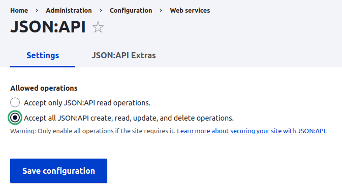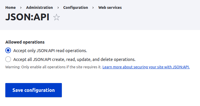 Das JSON:API-Modul in Drupal bietet standardmäßig begrenzte Konfigurationsoptionen und konzentriert sich hauptsächlich darauf, erlaubte Operationen zu regulieren.