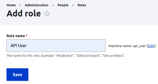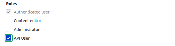 Für dieses Beispiel *Artikel*: Berechtigung "Neuen Inhalt erstellen".Erstellen Sie einen Benutzer mit der Berechtigung API-Benutzer: /admin/people/create