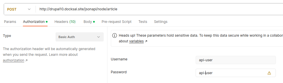 Konfigurieren Sie die Autorisierung in Postman. Verwenden Sie das neu erstellte Konto