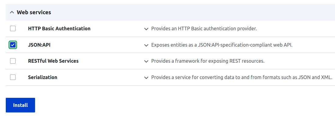 Um zu beginnen, stellen Sie sicher, dass das JSON:API-Modul auf Ihrer Drupal-Website aktiviert ist. Glücklicherweise ist dieses Modul in Drupal 8 und neueren Versionen als Kernmodul enthalten, daher müssen Sie keine zusätzlichen Erweiterungen installieren.